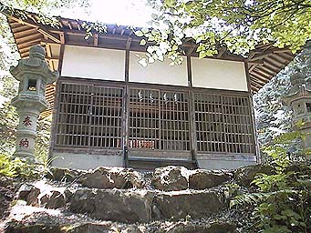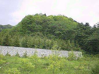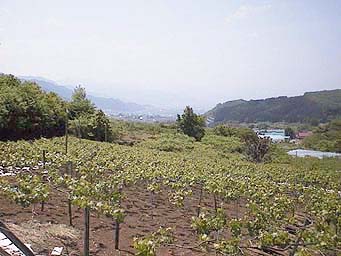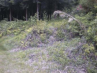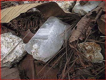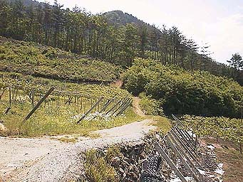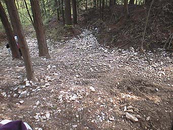 ●あったあった!いったい何百メートル登っただろう。山道をころげる石英の頻度がしだいに増し、パッと視界に開けたこのズリを見よ(石英ばかり)。しかし規模は竹森の何十分の1だ。おっと早くもV-I氏が採集を開始している(向かって左の木の向こう側)しかも、何も見ずに上まで登って来てしまった私にくらべ、彼はズリ探しの基本=「下から上へ」を守っている…サスガ?。