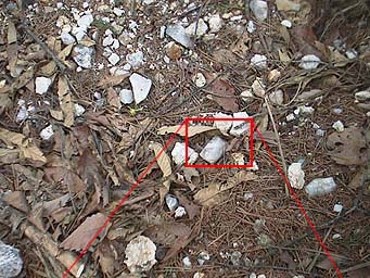 ●ズリの足元を見て見よう。ただの石がゴロゴロしているところに結晶らしきものが…赤ワクをクローズアップすると…