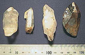 ●残念。これは、結晶面が2面しかなく、頭もない不完全なもの。最初、珍しいうちは、こういうものも拾ったりするが、結果的に持ち帰ってもゴミになるだけ。どうせならこの場で戻そう。決して他の鉱山に捨ててはいけない。(研究者が混乱するからね)<写真の左右10cm>